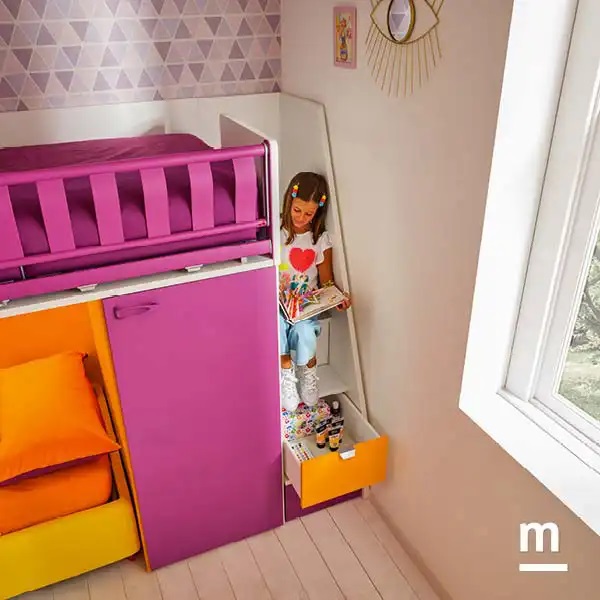 Для доступа к верхней кровати удобнее всего воспользоваться боковой лестницей. На первый взгляд она может показаться громоздкой, но на самом деле практична благодаря наличию выдвижных ящиков. Ящики, способные вместить игры и бережно хранить книги и предметы, выполняют двойную функцию.