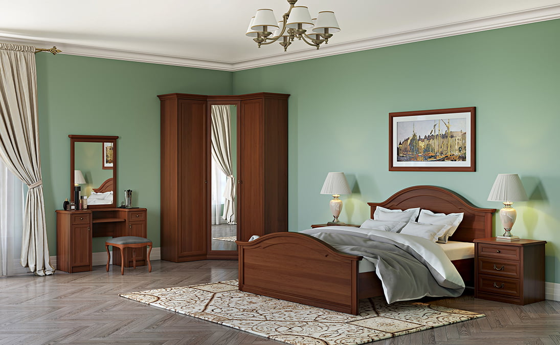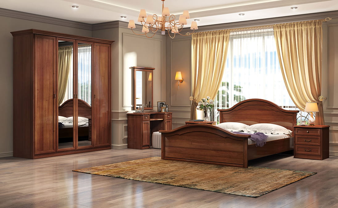 Эффектная мебель для спальни из коллекции Екатерина в цветовом решении орех – настоящее воплощение строгого, но притягательного классического стиля. В этих гарнитурах дизайнеры компании «МИАССМЕБЕЛЬ» сумели филигранно отобразить каноничные итальянские мотивы.
